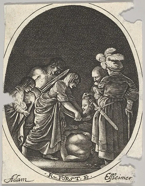 Salome receiving the head of John the Baptist, surrounded by three men and a child bearing a torch, the Baptist's body lies on the ground