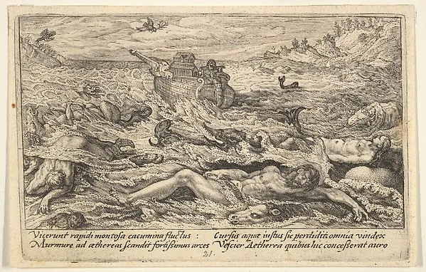 The Flood destroys life on earth: corpses of humans and animals adrift in the foreground, Noah's ark beyond and a flying dove holding a branch above, from "Liber Genesis"