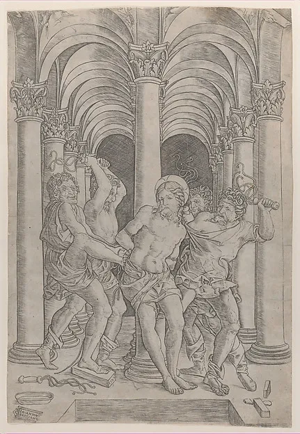The Flagellation of Christ who is tied to a column at center set within an arcade