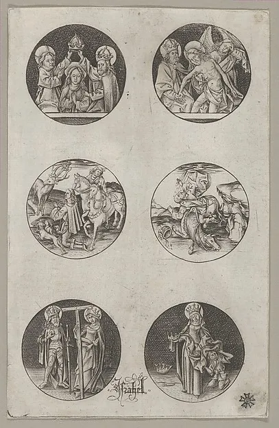 Six Roundel Patterns for a Goldsmith: the Coronation of the Virgin, God the Father with the Body of Christ, St. Eustace or St. Hubert, the Conversion of St. Paul, Charlemagne and St. Helen, and St. Elizabeth