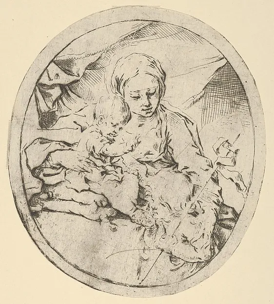 The Virgin with the infant Christ seated on a cushion and the young Saint John the Baptist at his feet, an oval composition