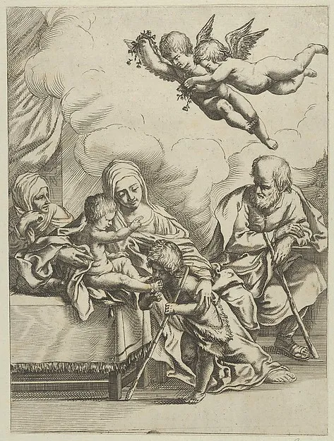 The Holy Family with young John the Baptist and Saint Elizabeth, two angels above, after Reni