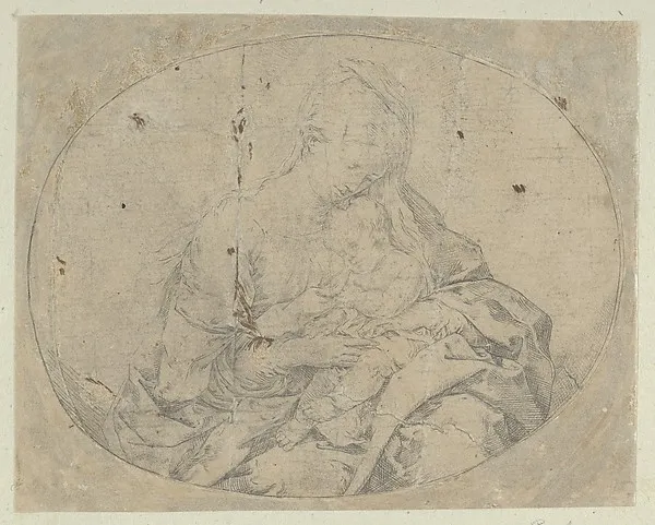 The Virgin holding the infant Christ, an oval composition, counterproof