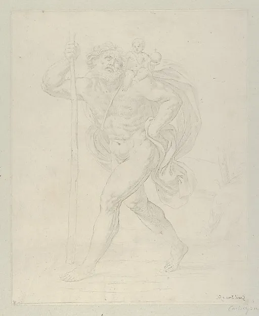 Saint Christopher walking with the infant Christ on his left shoulder