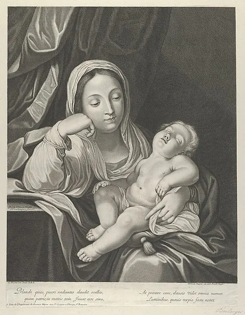 The Virgin seated with her head resting on her right hand, holding the sleeping infant Christ on her lap, after Reni