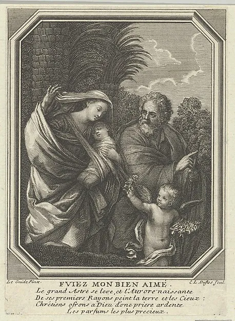 The Flight into Egypt; the holy family walking with the young John the Baptist, trees behind them, in an octagonal frame, after Reni