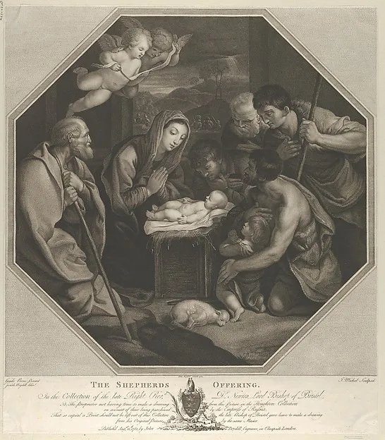 The infant Christ lying on a wooden box, the Virgin kneeling in prayer before him, Saint Joseph at left, shepherds at right, in an octagonal frame, after Reni