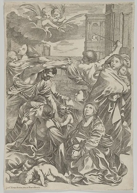 Massacre of the Innocents; group of women and children being attacked, two angels at upper left, after Reni