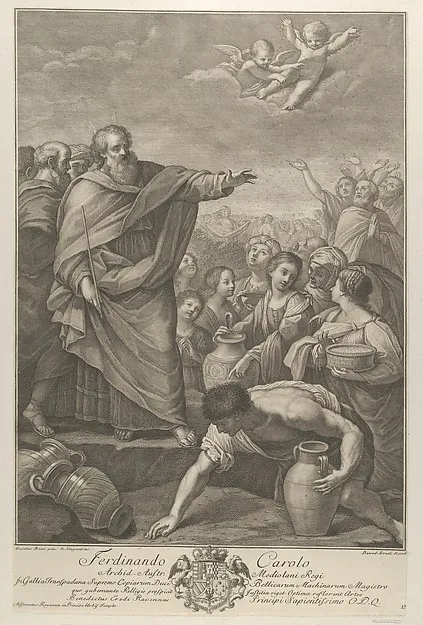 Moses at left with the Israelites who gather manna as it falls from the sky, two angels above, after Reni