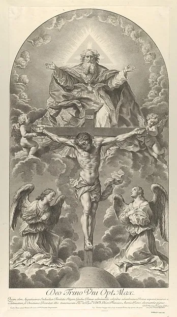 The Holy Trinity; Christ on the cross flanked by two angels, the Holy Spirit as a dove and God in heaven above the cross, a rectangular composition with half-circle at the top, after Reni