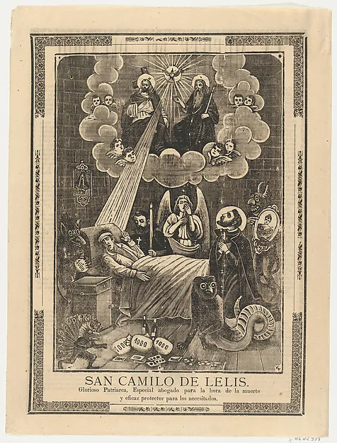 Broadsheet with Saint Camilo de Lelis in bed surrounded by demons, priests and the Holy Trinity above