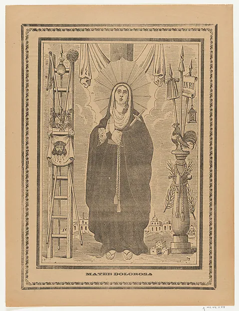 Broadsheet with the Virgin of Sorrows, flanked by instruments on the Passion