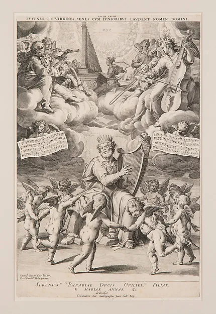 King David Playing the Harp with Angels Dancing and Playing Music