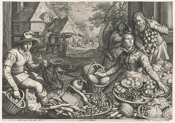 Market Scene, the Rest on the Flight into Egypt in the Background, from Kitchen and Market Scenes with Biblical Scenes in the Background