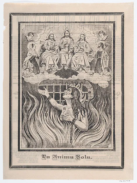 Broadsheet with image of a chained woman in purgatory and the Holy Trinity above