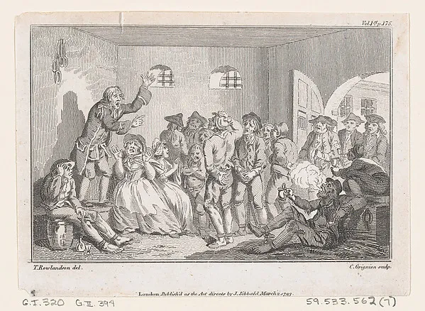 Clinker Preaching in Clerkenwell Prison, an illustration from Tobias Smollett's "The Expedition of Humphry Clinker" (London, 1793), Vol. 1