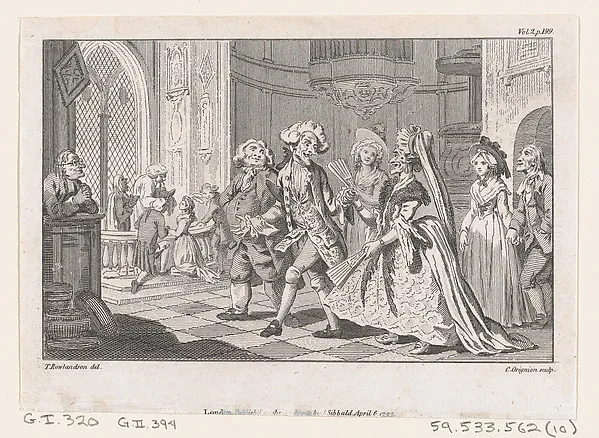 The Wedding of Lismahago and Tabitha, an illustration from Tobias Smollett's "The Expedition of Humphry Clinker" (London, 1793), Vol. 1. 1793