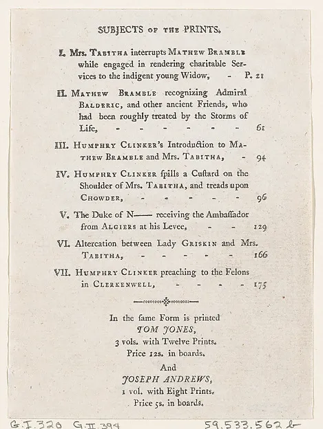List of Plates I-VII, from Tobias Smollett's "The Expedition of Humphry Clinker" (London, 1793), Vol. 1