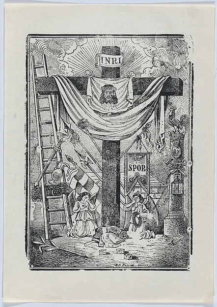 The cross decorated with instruments of the passion of Christ, two weeping angels below