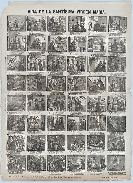 Broadside with 48 scenes of the life of the Virgin