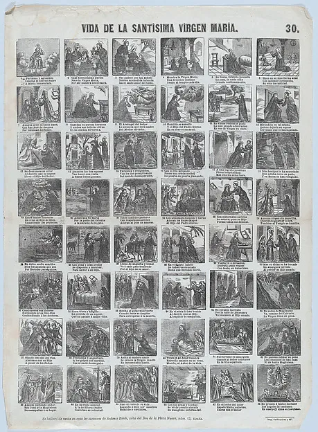 Broadside with 48 scenes of the life of the Virgin