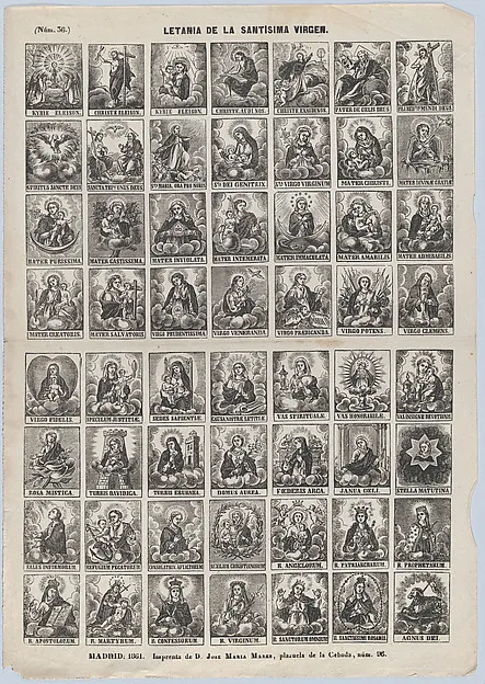 Broadside with 48 scenes relating to the litany of Holy Virgin