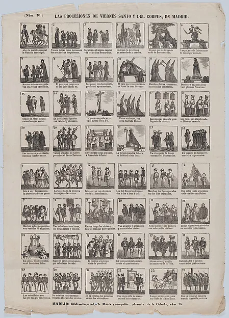 Broadside with 48 scenes showing the holy Friday procession in Madrid