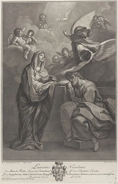 Plate 6: Saint Joseph's dream, with the Virgin Mary at left and an angel above who points to the Holy Spirit