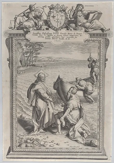 Christ calling Saint Andrew, who kneels before him on a beach, and Saint Peter, who climbs out of a boat at right