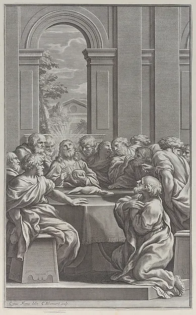The Last Supper, the interior of a classical building with Christ and his apostles seated at a table