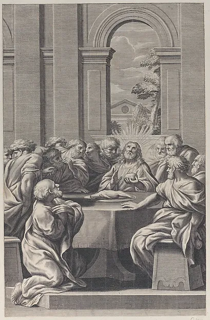 The Last Supper, the interior of a classical building with Christ and his apostles seated at a table