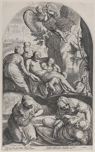 The Entombment, with Christ's body carried on a sheet at center, the three Maries in the foreground, and an angel overhead