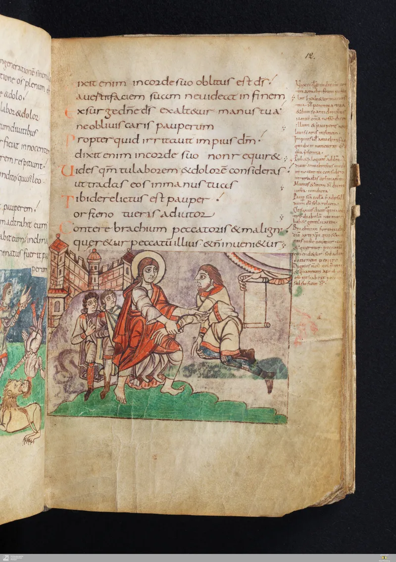 The Vulgate Psalter, illuminated at Saint-Germain-des-Prés c. 820–830. Folio 12r corresponds approximately to Psalm 6 in the Vulgate sequence.