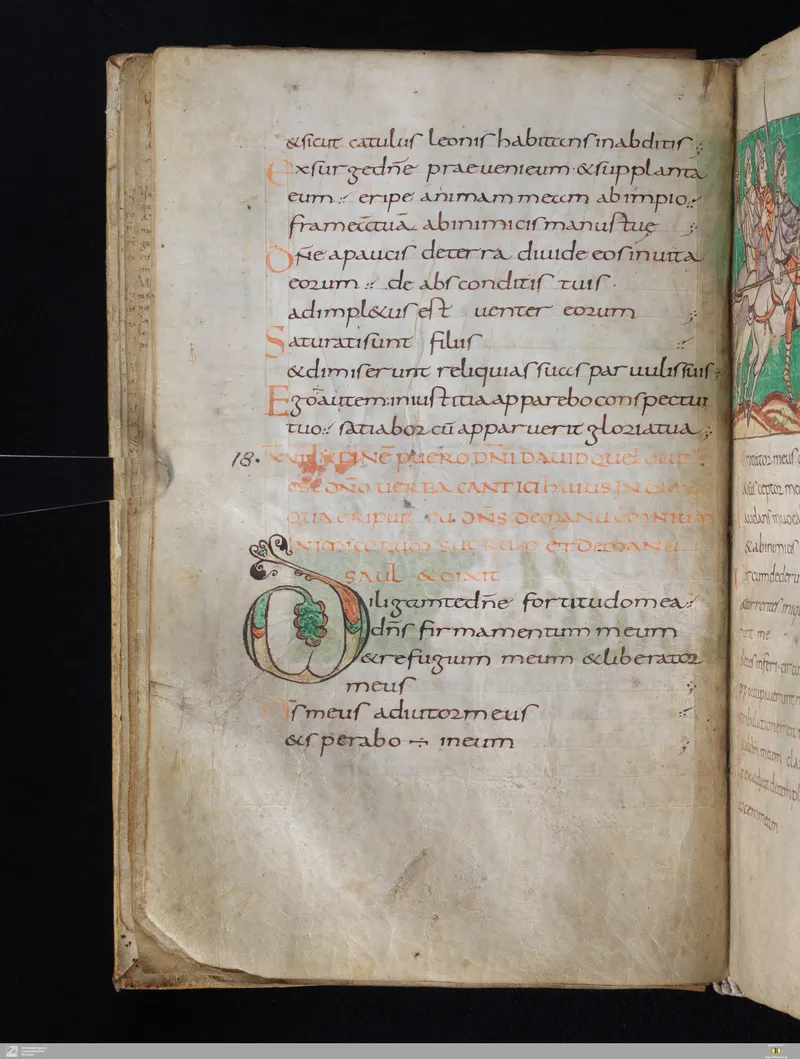 The Vulgate Psalter, illuminated at Saint-Germain-des-Prés c. 820–830. Folio 18v corresponds approximately to Psalm 12 in the Vulgate sequence.