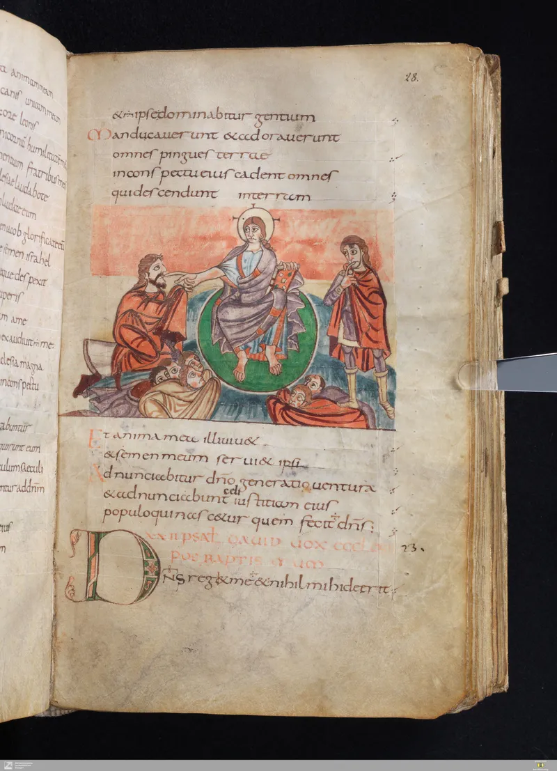 The Vulgate Psalter, illuminated at Saint-Germain-des-Prés c. 820–830. Folio 28r corresponds approximately to Psalm 21 in the Vulgate sequence.