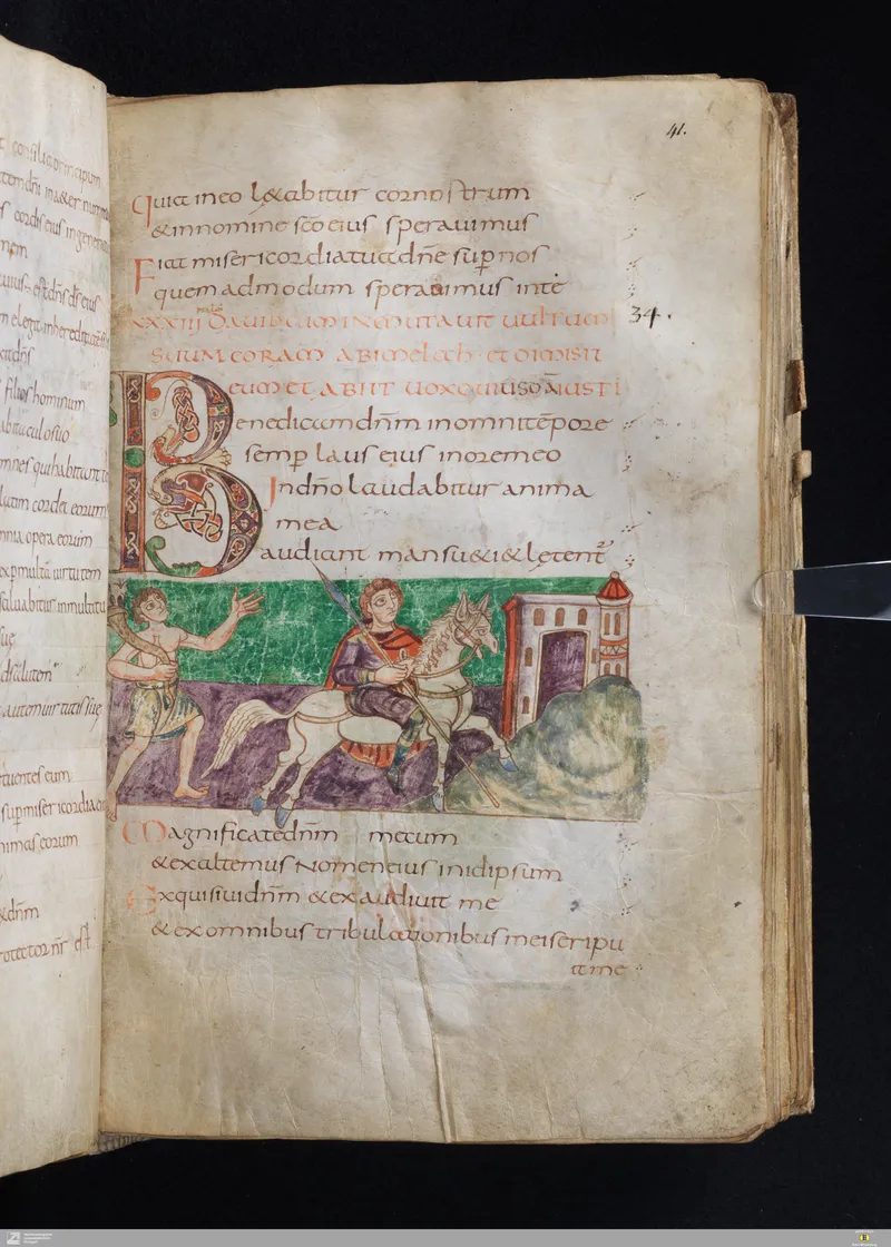 The Vulgate Psalter, illuminated at Saint-Germain-des-Prés c. 820–830. Folio 41r corresponds approximately to Psalm 33 in the Vulgate sequence.