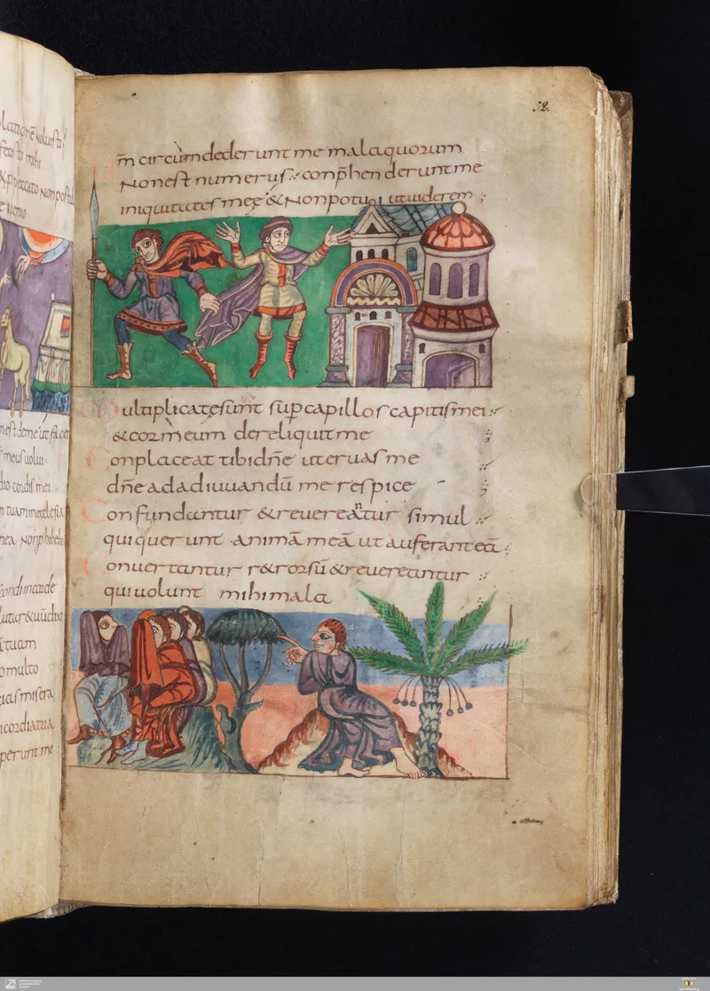 The Vulgate Psalter, illuminated at Saint-Germain-des-Prés c. 820–830. Folio 52r corresponds approximately to Psalm 43 in the Vulgate sequence.