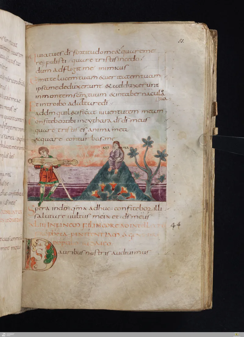 The Vulgate Psalter, illuminated at Saint-Germain-des-Prés c. 820–830. Folio 55r corresponds approximately to Psalm 46 in the Vulgate sequence.