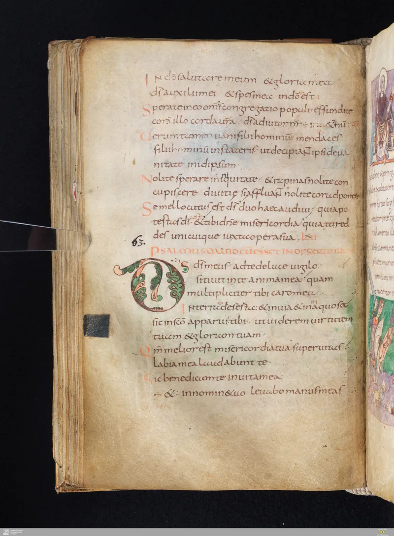The Vulgate Psalter, illuminated at Saint-Germain-des-Prés c. 820–830. Folio 73v corresponds approximately to Psalm 63 in the Vulgate sequence.