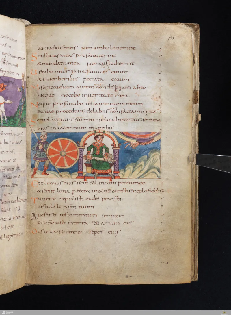 The Vulgate Psalter, illuminated at Saint-Germain-des-Prés c. 820–830. Folio 105r corresponds approximately to Psalm 93 in the Vulgate sequence.
