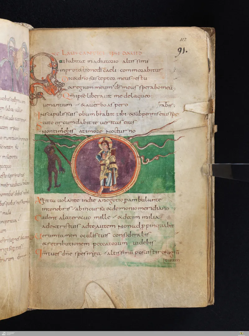 The Vulgate Psalter, illuminated at Saint-Germain-des-Prés c. 820–830. Folio 107r corresponds approximately to Psalm 95 in the Vulgate sequence.