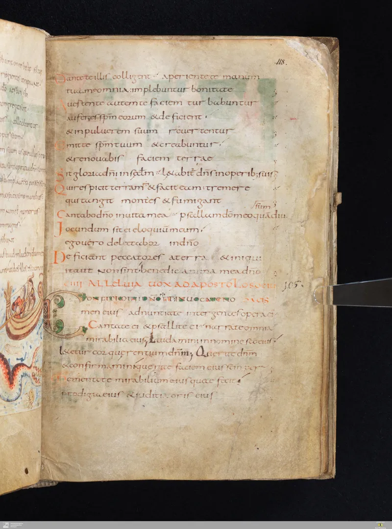 The Vulgate Psalter, illuminated at Saint-Germain-des-Prés c. 820–830. Folio 118r corresponds approximately to Psalm 106 in the Vulgate sequence.