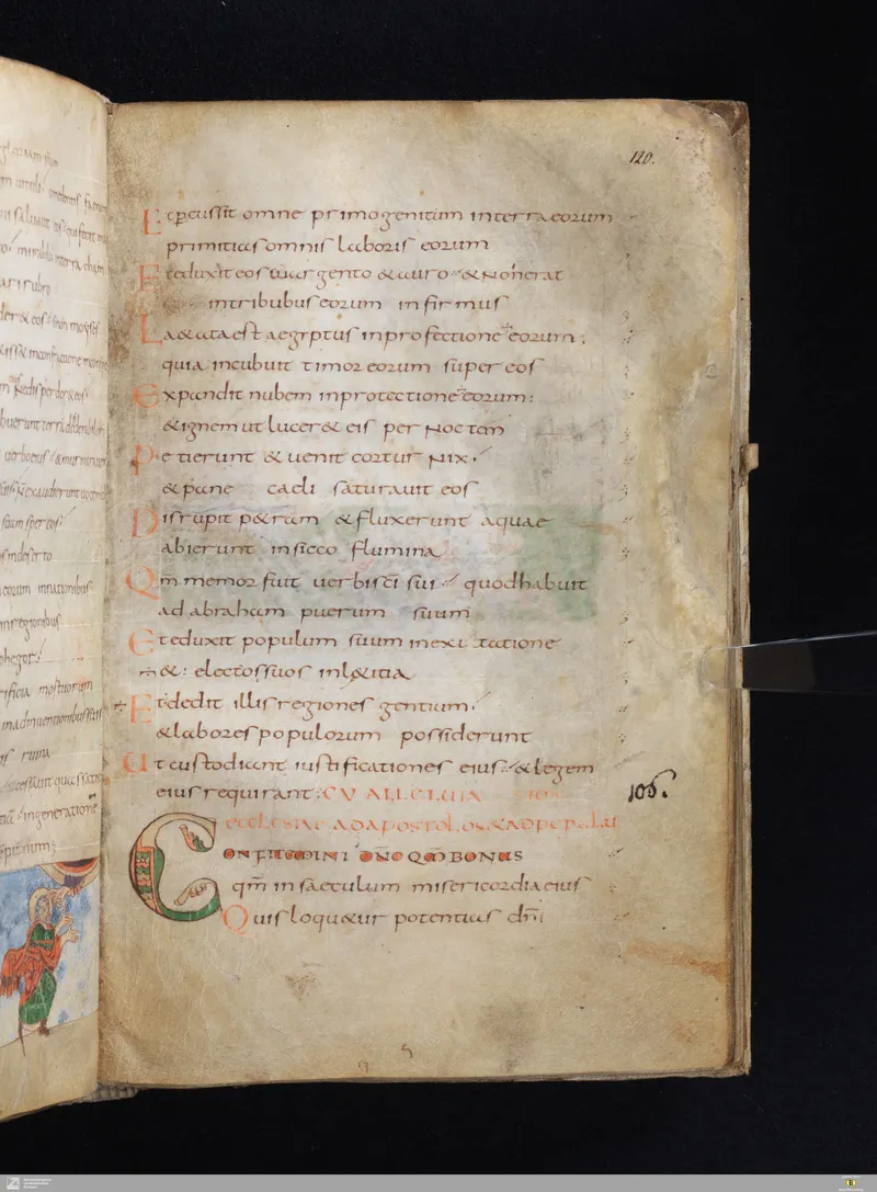 The Vulgate Psalter, illuminated at Saint-Germain-des-Prés c. 820–830. Folio 120r corresponds approximately to Psalm 108 in the Vulgate sequence.