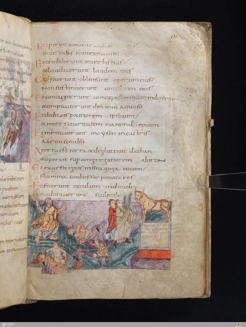 The Vulgate Psalter, illuminated at Saint-Germain-des-Prés c. 820–830. Folio 121r corresponds approximately to Psalm 109 in the Vulgate sequence.