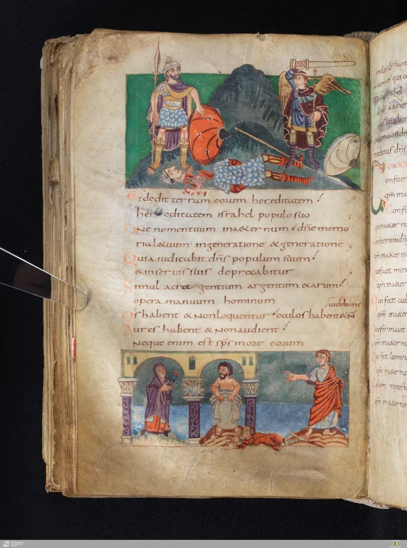 The Vulgate Psalter, illuminated at Saint-Germain-des-Prés c. 820–830. Folio 150v corresponds approximately to Psalm 136 in the Vulgate sequence.