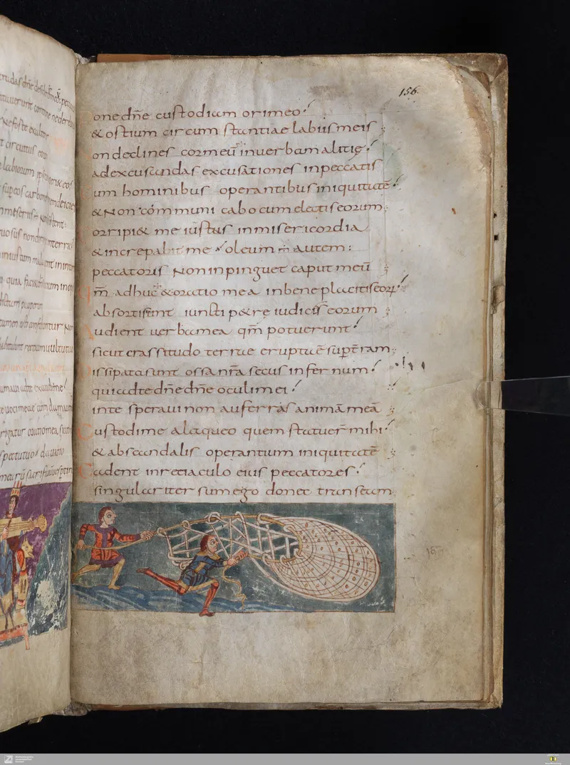 The Vulgate Psalter, illuminated at Saint-Germain-des-Prés c. 820–830. Folio 156r corresponds approximately to Psalm 141 in the Vulgate sequence.