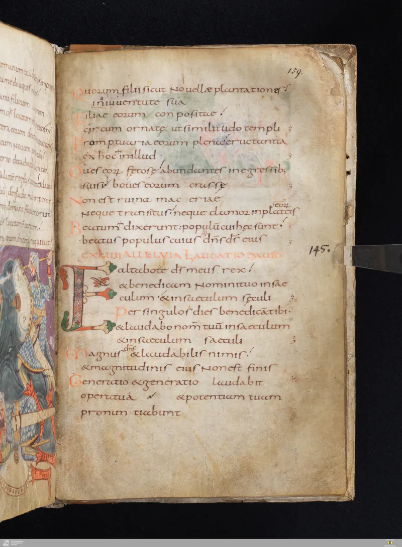 The Vulgate Psalter, illuminated at Saint-Germain-des-Prés c. 820–830. Folio 159r corresponds approximately to Psalm 144 in the Vulgate sequence.