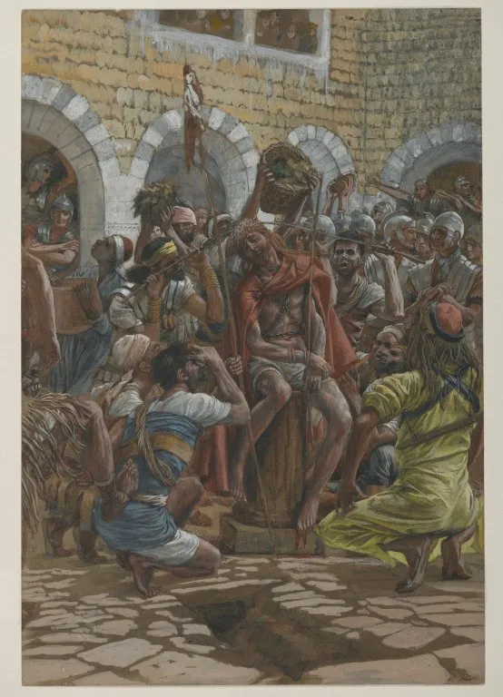 Soldiers mock Jesus with thorns and purple robe before the crucifixion.