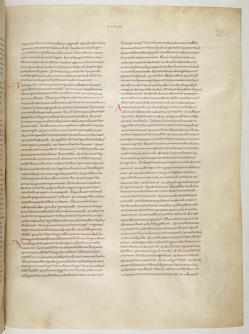 Folio 757 of the First Bible of Charles the Bald, an extant Carolingian Vulgate manuscript from the Tours scriptorium (c. 845). Approximately corresponds to 1 Corinthians 9 in Vulgate book order. The folio shows the actual ninth-century Latin text and decoration as it would have been read in the Carolingian court.