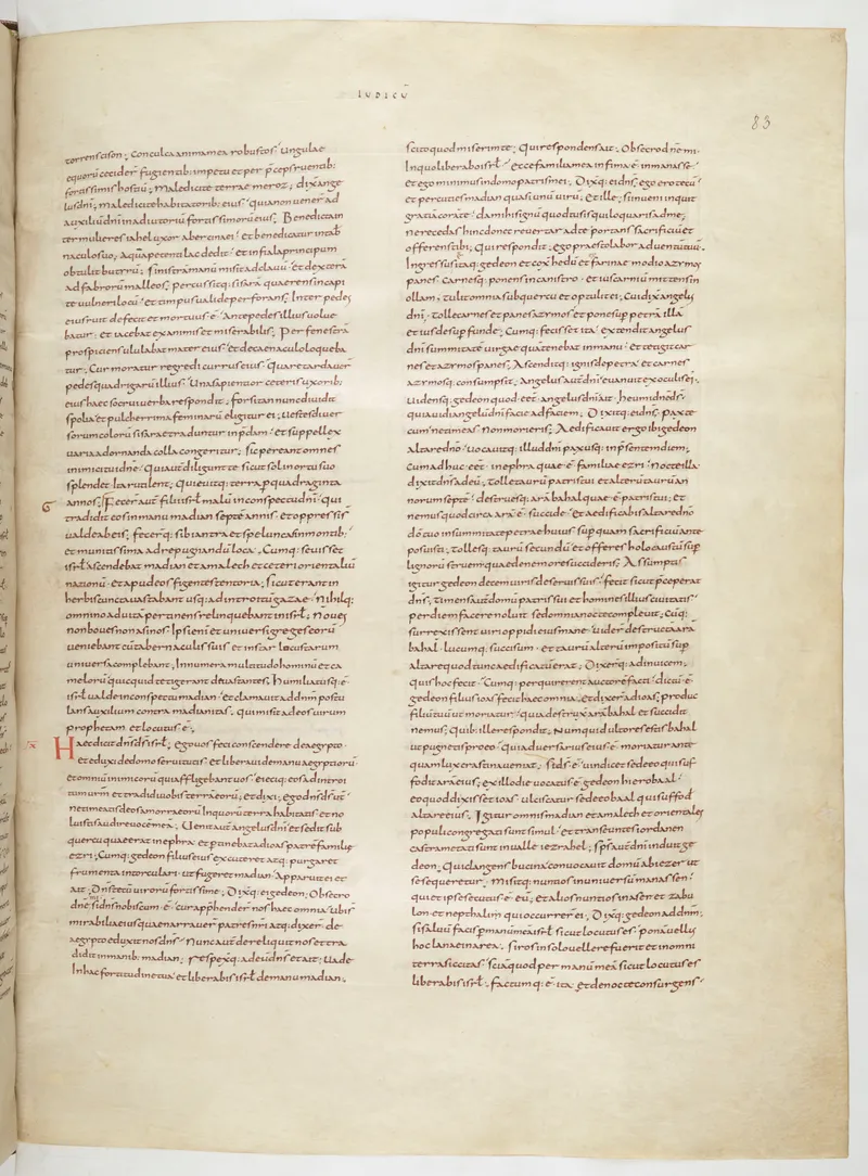 Folio 173 of the First Bible of Charles the Bald, an extant Carolingian Vulgate manuscript from the Tours scriptorium (c. 845). Approximately corresponds to 1 Samuel 29 in Vulgate book order. The folio shows the actual ninth-century Latin text and decoration as it would have been read in the Carolingian court.